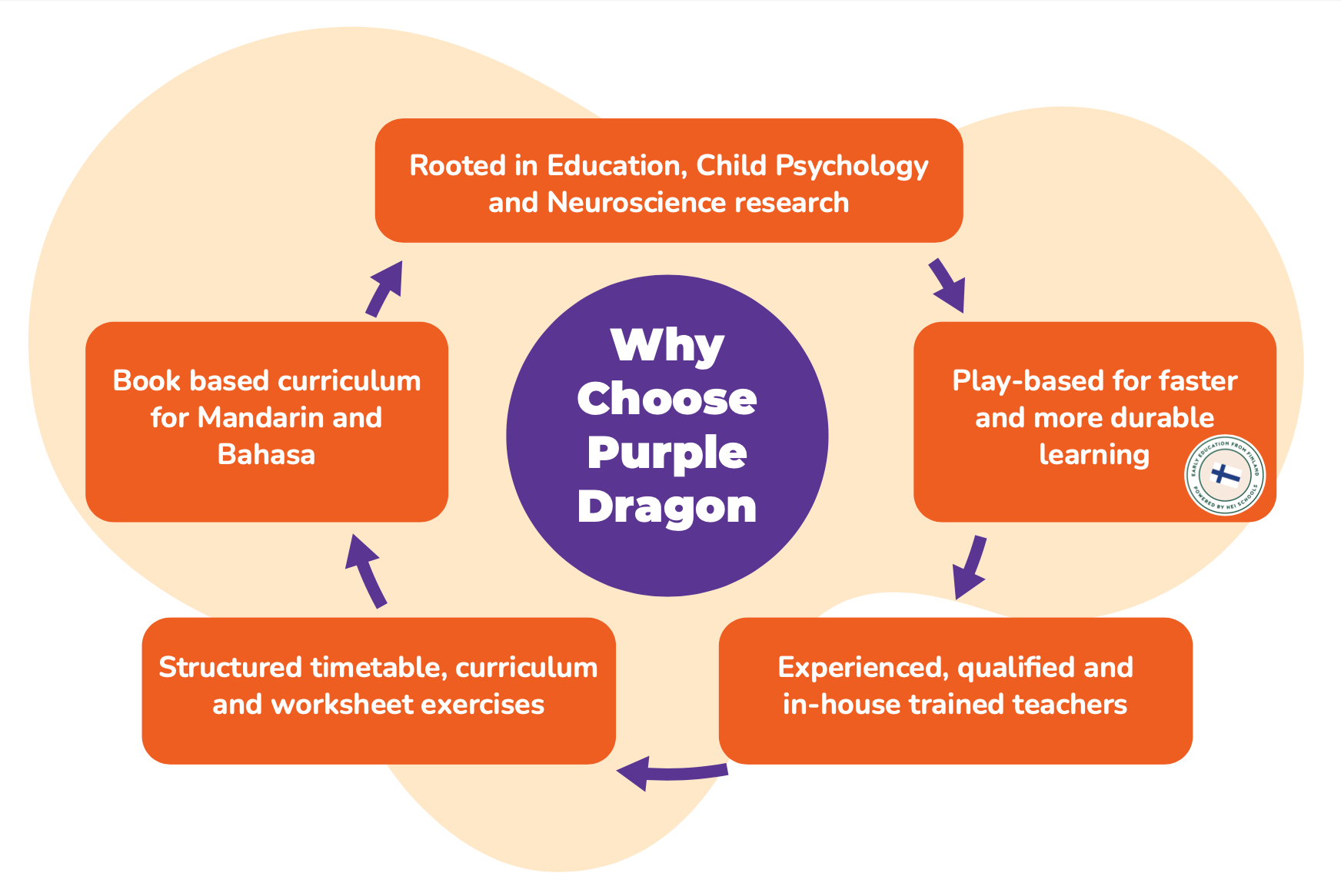 Play-based learning techniques, such as the HEI School of Finland, bring the concepts of leading child psychologists like Piaget, Vygotsky and Ackermann on how children develop together with those of neuroscience research into how children’s brains develop. The play-based method produces much faster and more durable learning and development than other methods because it is aligned to how children think and explore the world naturally. We overlayed this with social learning from experience, qualified teachers who know how to apply the concepts to maximise the benefits for your children. This is underpinned by a structured timetable; centrally crafted curriculum and lesson plans; and regular milestone achievement monitoring and action planning. In addition, we use written and visual worksheet exercises to reinforce and recap learning objectives and book sets for Bahasa and Mandarin. We extract the best of the latest methods with the structure of the traditional approach to get the best of both.